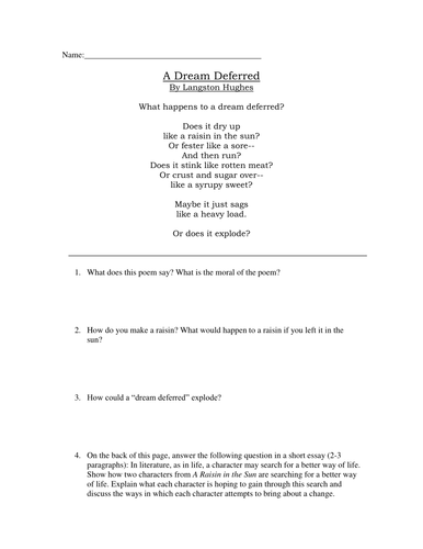 I took it and made it a poem in it's own right. Does it dry up like a raisin in the sun? The dream deferred hughes writes of is the dream of equal rights, both de jure (by law) and de facto (in real life) for black americans. Like a raisin in the sun?
