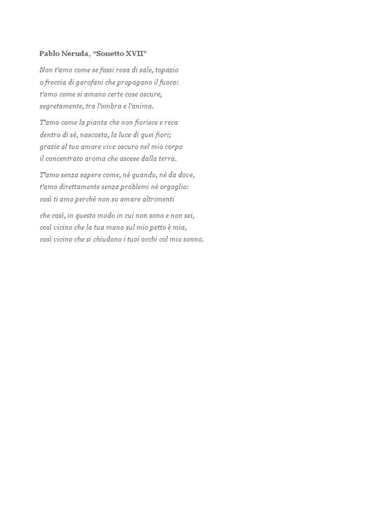 Pablo neruda (ricardo eliécer neftalí reyes basoalto) soneto xvii songtexten: It's internalized and private, but it still consumes him. Non t'amo come se fossi rosa di sale, topazio. Xvii from the essential neruda: