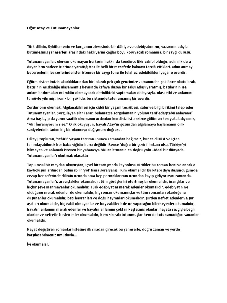 Berna moran, oğuz atay'ın bu ilk romanını hem söyledikleri hem de söyleyiş biçimiyle bir başkaldırı olarak niteler. Pek çok eleştirmen, tutunamayanlar'ı türk dili'nde yazılmış en iyi eser olarak değerlendirmektedir. Berna moran, oğuz atay'ın bu ilk romanını hem söyledikleri hem de söyleyiş biçimiyle bir başkaldırı olarak niteler. Bu sefer sizlere oğuz atay'a ait tutunamayanlar adlı eseri tanıtacağım.