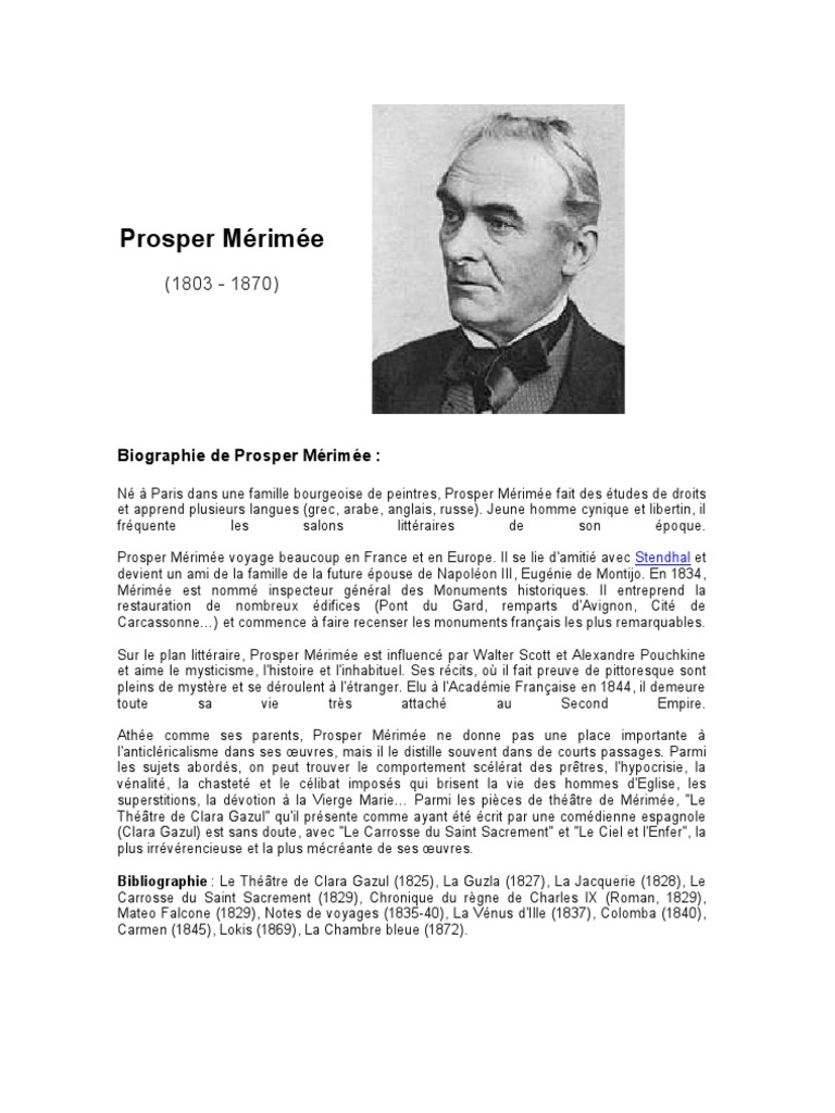 Prosper mérimée, inspecteur général des monuments historiques et bon connaisseur des arts et de l'architecture, reste dans la littérature, avec des oeuvres aussi célèbres que colomba, carmen, matteo falcone ou la vénus d'ille, comme un des maîtres de la nouvelle. L'inspecteur général des monuments historiques. Mérimée devient inspecteur général des monuments historiques.